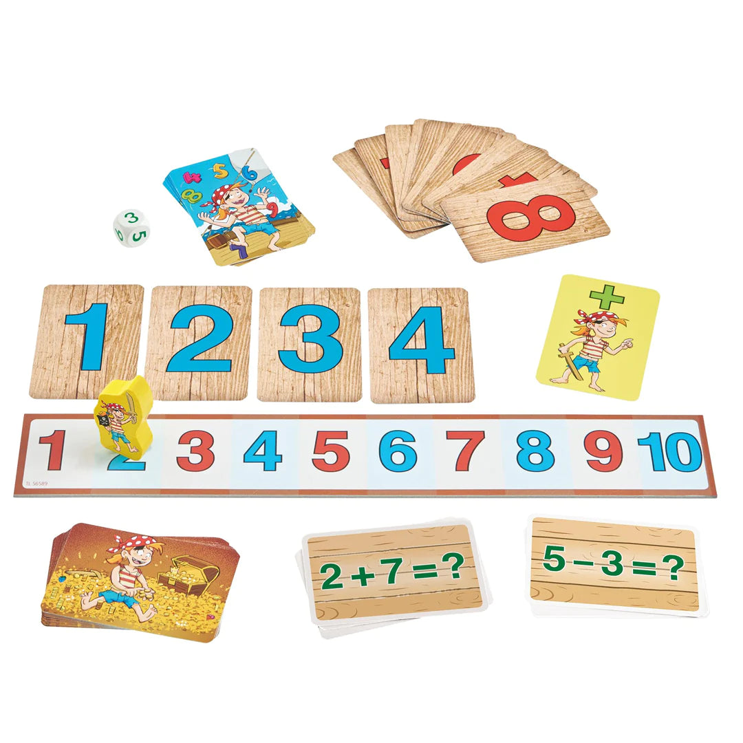 - Incluye: 1 pirata, 1 dado, 20 cartas de números, 10 cartas de operaciones, 5 cartas en blanco, 1 carta de suma y resta, 1 lista de números y las instrucciones del juego.